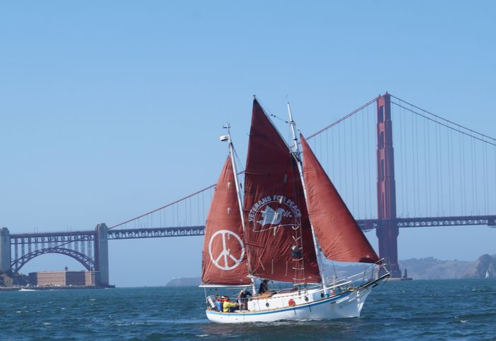 The historic peace boat Golden Rule Sails by the Golden Gate Bridge