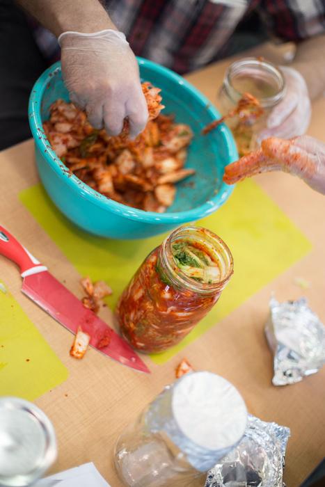 Scientists and chefs have collaborated on a new study that demonstrates how fermented foods can be used to drive participatory science projects that both engage the public and advance our understanding of microbial ecology. The study focused on working with food experts and the public to examine the microbial communities associated with kombucha, kimchi and chow chow. This photo shows a study participant preparing a jar of kimchi.