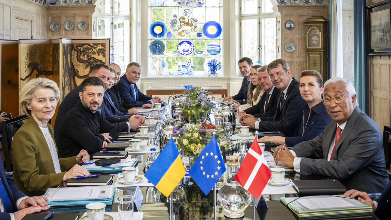European Commission President Ursula von der Leyen (L), Ukraine's President Volodymyr Zelensk, Danish Prime Minister Mette Frederiksen (2R) and President of the European Council António Costa, meet at Marselisborg Castle in Aarhus, Denmark, on July 3, 2025. © Ida Marie Odgaard, AFP