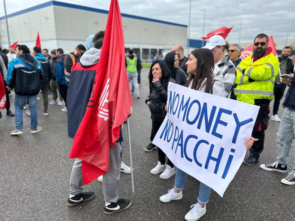 Italian Amazon workers strike in April with a sign reading, “No money, no parcels.”FILT CGIL di Roma e del Lazio