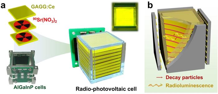 A collaborative team, led by Prof. Haisheng San from Xiamen University in China, Prof. Xin Li from the China Institute of Atomic Energy in China, and their colleagues, has made a remarkable breakthrough in this field. In a new paper published in Light: Science & Applications, they presented a novel 90Sr radio-photovoltaic cells (RPVC) based on a waveguide light concentration (WLC) structure. This innovative design integrates multilayer-stacked GAGG:Ce scintillation waveguides with 90Sr radioisotopes.