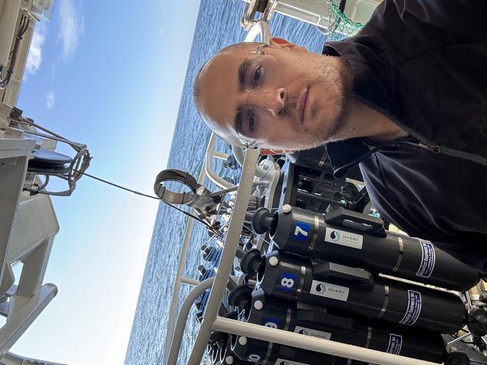 Researcher Léon Chafik aboard an oceanographic expedition at the Greenland–Scotland Ridge, with a CTD rosette in the background used to measure temperature, salinity, and other water properties throughout the water column.