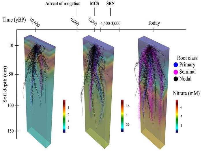 — By 6,000 years ago: Irrigation was introduced, changing nitrogen availability — less in the topsoil, more in deeper layers. That further reduced nodal roots and presence of multiseriate cortical sclerenchyma became more useful in accessing this subsoil nitrogen.