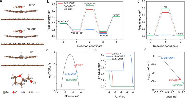 Theoretical analysis of the FRR performance on HMC models. (a) Optimized atomistic models of the ZnPc/CNT catalyst with different intermediates and the assignment of potential adsorption sites in the furfural molecule. (b) and (c) Calculated reaction free energy schemes along various pathways on different metal centers. (b) FRR and (c) HER pathways. (d) Calculated proton coverage and (e) and (f) microkinetic modelling results of (d) the HER and (e) FRR on different metal centers.