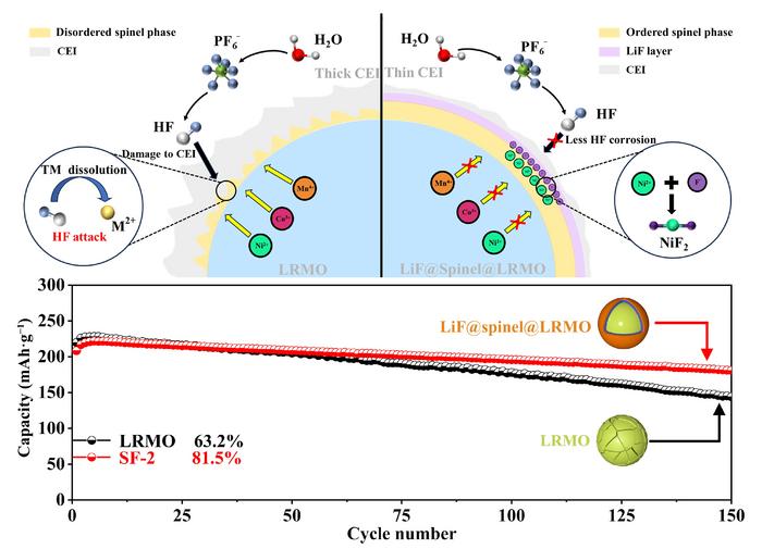 The team’s approach centered on building a two-part shield around the LRMO cathode. Using an in situ reconstruction process, a spinel intermediate layer was grown directly on the cathode surface. This spinel provides a three-dimensional framework for lithium-ion transport, ensuring that high capacities can be accessed quickly. The outer LiF coating, chemically anchored by Ni–F bonds, firmly attaches to the spinel and isolates the electrode from harmful electrolytes. Advanced tools such as transmission electron microscopy and X-ray photoelectron spectroscopy confirmed the seamless integration of the dual shell. The performance gains were striking: at a demanding current of 2 C, the protected cathode retained 81.5% of its capacity after 150 cycles, compared to only 63.2% for its unmodified counterpart. Even under ultrafast cycling at 5 C, the dual-shell design maintained more than 80% capacity. Electrochemical impedance tests further revealed lower resistance and higher ion diffusion rates, while post-cycle surface analyses showed fewer corrosive by-products and greater structural stability. Taken together, the results highlight how the LiF@spinel strategy addresses both chemical degradation and ion-transport limitations, delivering a balanced solution for high-energy lithium-ion batteries.