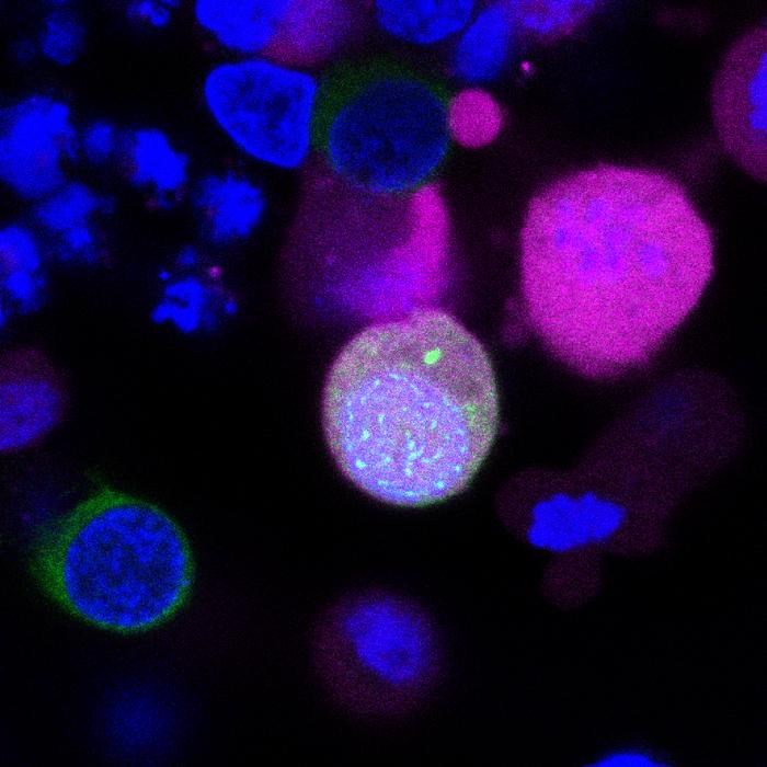 This fluorescence microscopy image shows induced pluripotent stem cells (iPSCs) that, for the first time, have been induced to enter and partially proceed through meiosis, a key process during the development of eggs and sperm, in a culture dish. The punctate marker shown in green indicates that the meiotic cells’ chromosomes started to pair and exchange genetic information.