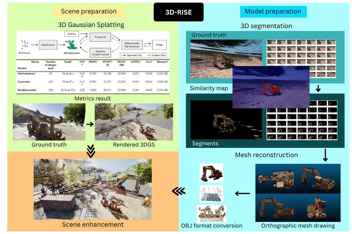 The 3D-RISE model enables realistic and editable construction site simulations by combining automated 3D reconstruction, segmentation, and mesh editing. It operates in two modes: 1) Scene preparation using 3DGS to reconstruct entire environments; 2) Model preparation using SAGA + SuGaR to extract and customize individual objects.