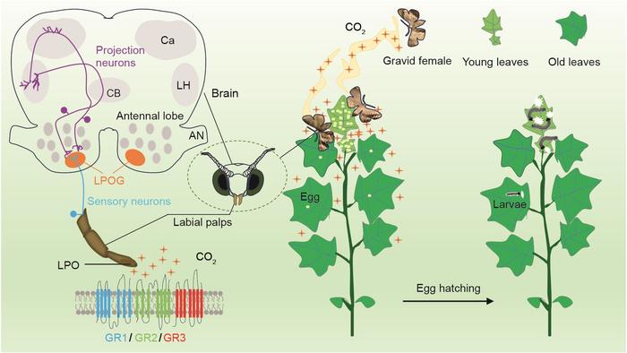 Schematic representation of the sensory mechanisms underlying CO2-induced oviposition behavior in Helicoverpa armigera. Abbreviations: LPO, labial pit organ; LPOG, labial pit organ glomerulus; CB, central body; Ca, calyx of the mushroom body; LH, lateral horn; AN, antennal nerve.