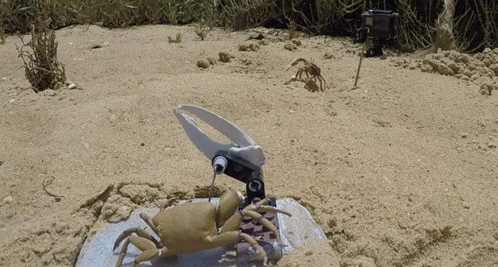 For each test, the robot crab was set up 30cm from a real male’s burrow, with two cameras recording.