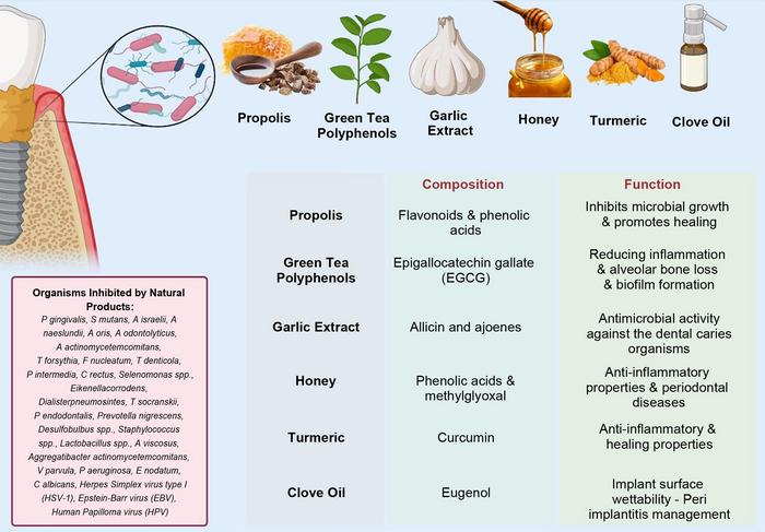 Peri-implantitis management: Propolis and EGCG reduce pathogenic bacteria (e.g., Porphyromonas gingivalis) and inflammation. Adjunctive use with mechanical debridement improves outcomes.