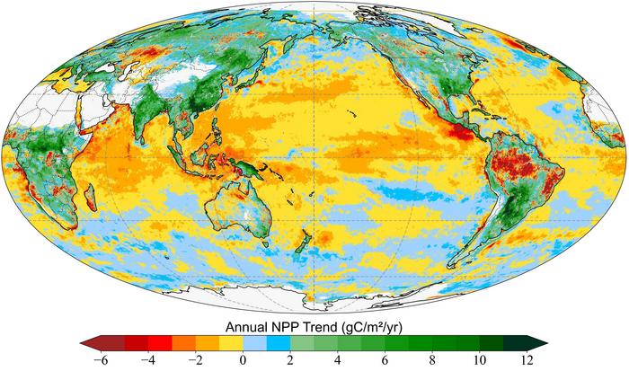 For this study, the team explored annual trends and variability in global net primary production, with a focus on the interplay between land and ocean ecosystems.