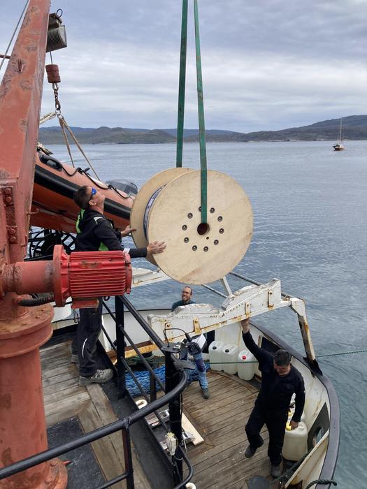 ulia Schmale, an assistant professor at École Polytechnique Fédérale de Lausanne (left), and Manuela Köpfli, a University of Washington graduate student in Earth and space science (right) unspool the fiber optic cable from a large drum, sending it down to the fjord-bottom to record data.