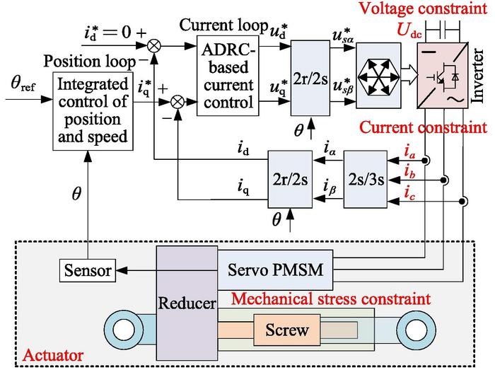 The method involves changing the triple-loop cascade control to a dual-loop control architecture with an integrated outer loop for position and speed control and an inner loop for current control. Meanwhile, aviation electro-mechanical actuation systems face various nonlinear constraints, such as voltage, current, mechanical stress, power supply characteristics, and heat dissipation. It is necessary to achieve performance optimization through nonlinear ADRC.