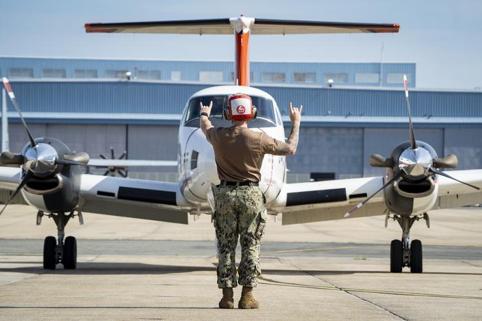 Lt. Avery Nwokike, Scientific Development Squadron One (VXS-1) pilot, flies an RC-12M in Patuxent River, Md. May 2, 2025. VXS-1 conducts airborne scientific experimentation and advanced technology development in worldwide operations supporting U.S. Navy and national science and technology (S&T) priorities and war fighting goals.