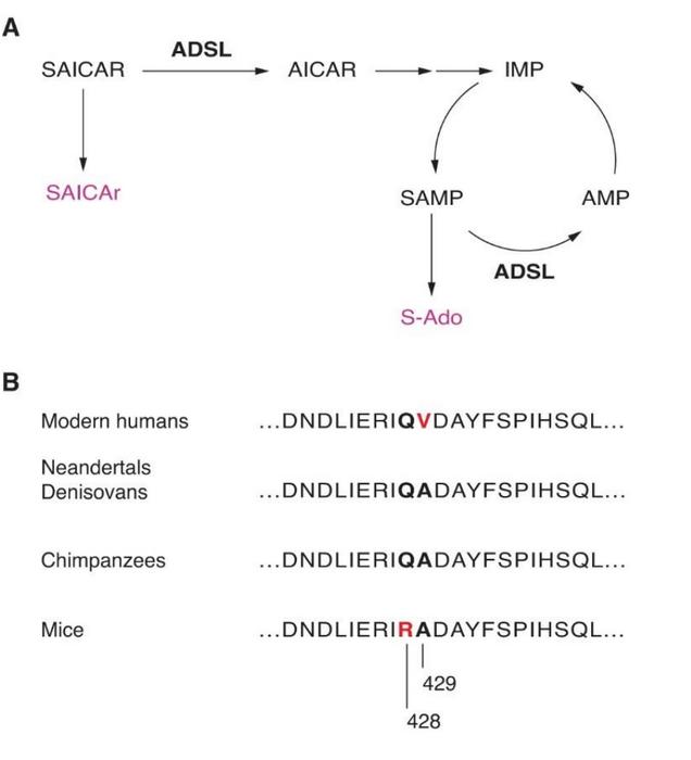 In the study, the researchers examined the activity of ADSL by measuring the concentration of protein substrates SAICAr and S-Ado (in red), which increase when ADSL activity decreases. Below, the amino acid sequence differences among modern humans, Neanderthals and Denisovans, chimpanzees, and mice are shown. The change at position 429 is the only difference between modern humans and ancestral hominins. The substitution in mice on position 428 (in red) was not found to alter the activity of ADSL.