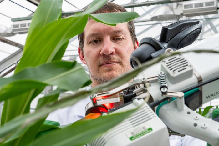 Michigan State University researcher Berkley Walker measures how much CO2 a plant takes in by clamping its leaves in an infrared gas analyzer.
