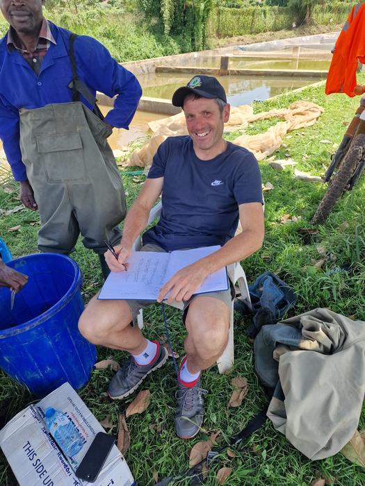 Professor Andrew S. Brierley records field notes during the stocking of African catfish (Clarias gariepinus) as part of a schistosomiasis biocontrol project on the shores of Lake Victoria, Tanzania.