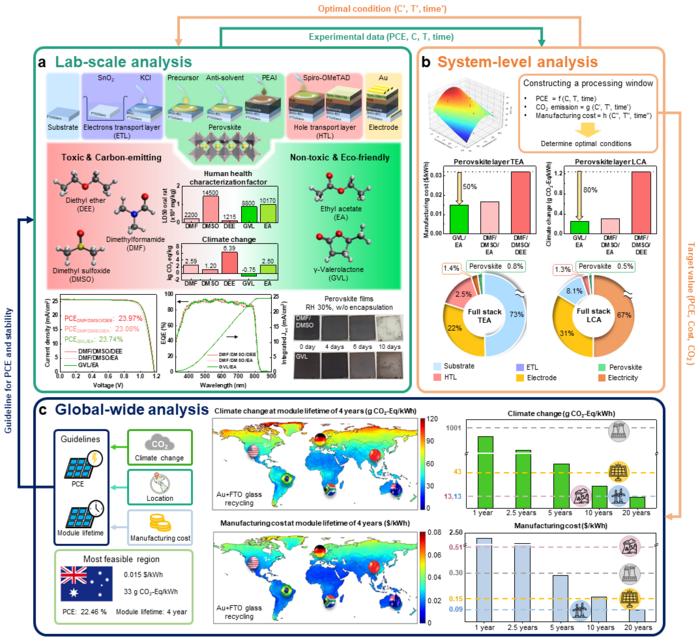 The GVL-EA process developed by the research team reduces the manufacturing cost of perovskite solar cells by half and decreases the climate impact by over 80%. Additionally, they confirmed that considering module lifespan and recycling strategies together can help identify the actual break-even point for commercialization in different regions.