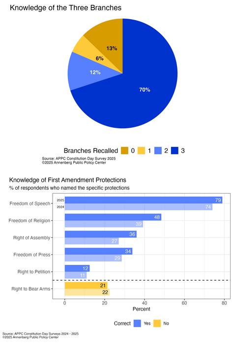 More than two-thirds of U.S. adults (70%) are able to name all three branches of government – the executive, judicial, and legislative – significantly more than a year ago (65%). When asked which rights the First Amendment guarantees, 79% can name “freedom of speech,” an increase over 2024 (74%).