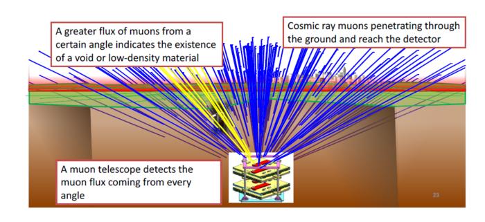 Muons continually bombard the ground at a known rate and angular distribution. As muons lose energy when passing through matter, their flux is attenuated depending on the integrated density along their path. A higher-than-expected flux from a specific direction indicates reduced attenuation, suggesting the presence of a void or low-density region (marked here as yellow lines). The muon telescope detects these angular flux variations to create maps of subsurface structures.