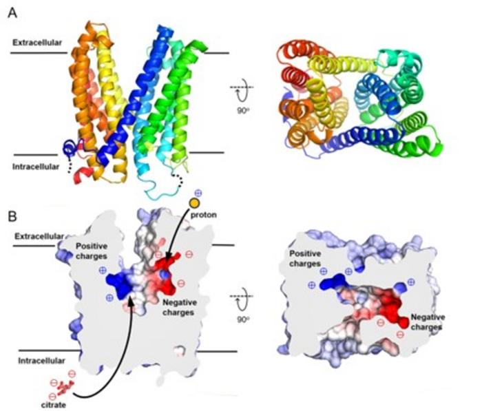 The 3D structure of the barley root protein HvAACT1, shown at about 10 million times its actual size. (A) Ribbon models highlight the overall shape of the protein from two angles. (B) Surface models reveal a central cavity with regions of positive and negative charges. Citrate molecules (red) bind to positive regions, while protons (yellow) bind to negative regions—together powering the transporter to expel citrate into the soil, where it locks away toxic aluminum.