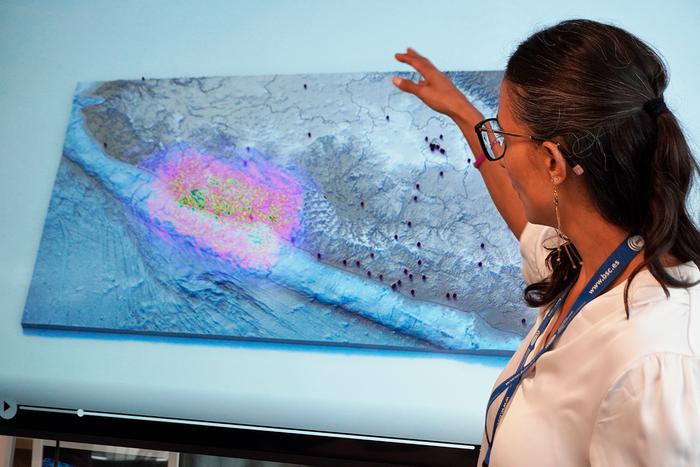 Researcher Marisol Monterrubio explaining an earthquake simulation.