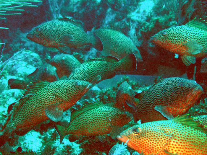 A group of red hind groupers, which produce sounds associated with courtship, territoriality or mating.
