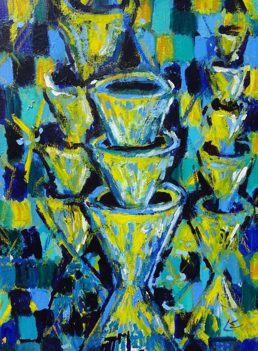 The phenomenon in physics known as “Floquet states”, which have now been observed in graphene for the first time, as envisaged by artist Lina Segerer. This image “Dirac Cones I” explores the concept of Floquet states in graphene generated by light pulses. The painting shows the three-dimensional electronic structure of graphene – known as Dirac cones – and their replicas created by light.