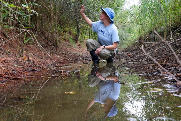Scientist Chelsea Clifford explores a ditch near Woodville Park in Gloucester, VA. Photo by John Wallace
