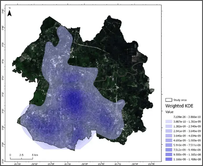 “We define an urban functional area as the spatial extent of concentrated urban functions,” Maghfira explained. “We used Points of Interest (POI) data as a form of social sensing to capture behavioral patterns through locations that people frequently visit throughout the day. We analyzed this data using Kernel Density Estimation (KDE) and enhanced it with spatial autocorrelation, developing an urban delineation that reflects how urban spaces are used. This approach is especially valuable in cities like Pekanbaru, where conventional delineations may obscure the true dynamics of urban life.”
