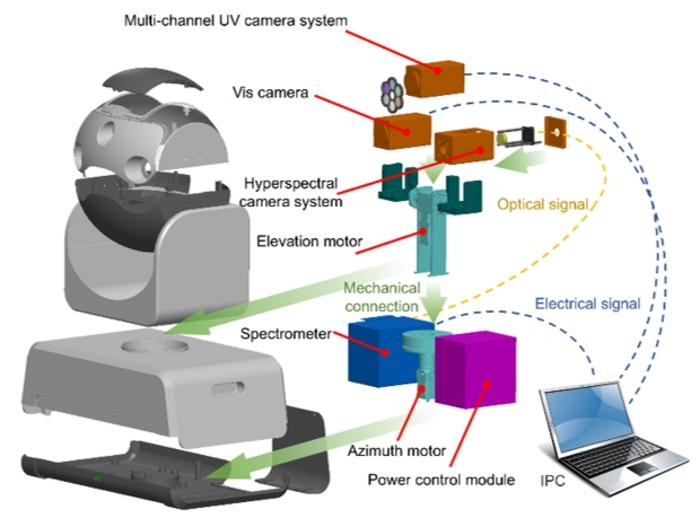 Fig. 1: Schematic of the fast-hyperspectral imaging remote sensing instrument, detailing its five major components: telescope (including visible, multichannel UV, and hyperspectral cameras), 2D scanning system, spectrometer, power control module, and IPC.