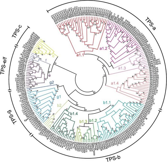 A rooted phylogenetic tree of functionally characterized TPSs in angiosperms. The tree encompasses TPS protein sequences from 15 eudicots and 9 monocots. The five previously defined TPS subfamilies (a, b, g, e/f, and c) in angiosperms are indicated and branches are color-coded based on different clades and subclades. The TPS-a subfamily contained only one clade (a1), while the TPS-b and g subfamilies were classified into two major clades (b1 and b2; g1 and g2). The a1 and b1 clades were further divided into four subclades (a1.1, a1.2, a1.3, and a1.4; b1.1, b1.2, b1.3, and b1.4).