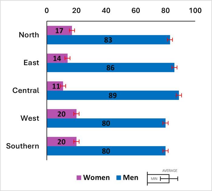 This figure presents two bar charts comparing the representation of women and men in leadership roles across five African sub-regions: North, East, Central, West, and Southern Africa. Each region displays a stark gender disparity, with men consistently occupying the majority of leadership positions. Women’s representation ranges from 11% in Central Africa to 20% in West and Southern Africa. Error bars indicate variability across countries within each region, emphasizing both the persistent gender gap and regional differences in progress toward inclusive leadership in water governance. [Source: UNU-INWEH]