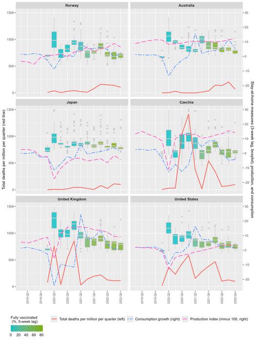 The figure illustrates the six distinctive countries referenced in our research paper. The number of deaths (red line) varies considerably across countries, as does the distribution of stay-at-home measures (box plots). While vaccination rates (colors within box plots) show differences in initiation timing, there were no significant disparities by the end of 2022. Furthermore, from 2022 onward, some countries have achieved recovery in consumption (dot-dash line) and production (dashed line), while others have not.