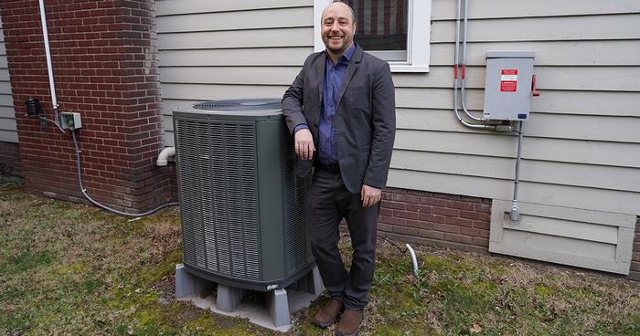 Kevin Kircher, a Purdue University assistant professor of mechanical engineering, stands next to a home's heating, ventiliation and air conditioning unit. He studies the electrification of homes and vehicles.