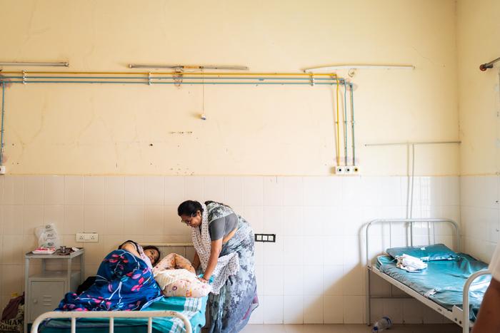 In a hospital in Karnataka, India, a smiling grandmother leans over her newborn grandchild, as the baby's mother rests beside them.