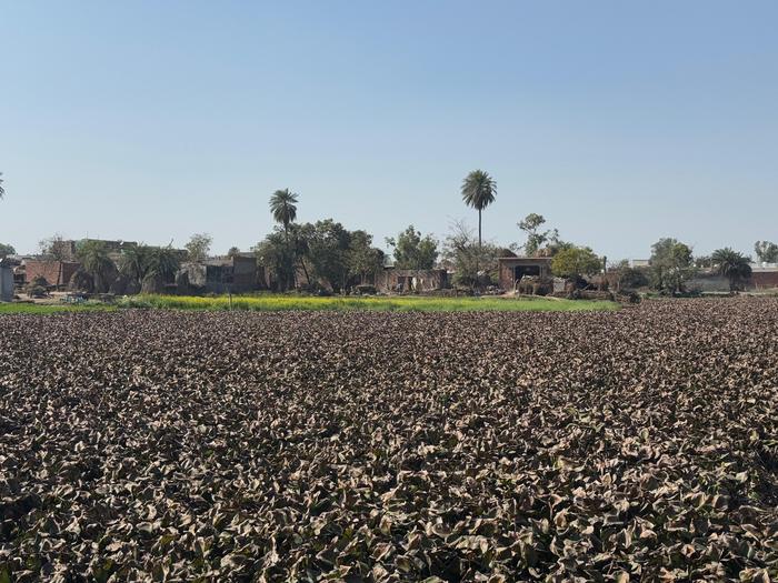 The invasive water hyacinth has taken over a communal pond in a small village in northern India. All other plants have been pushed out.