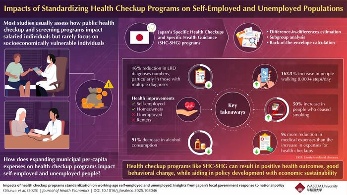 “We used dosing difference-in-differences estimation and subgroup analysis to explore the effects of increasing municipal expenditure under the SHC-SHG policy standardization on health outcomes and behaviors among the self-employed and unemployed individuals. Additionally, we did a back-of-the-envelope calculation to estimate the cost-effectiveness of this increase in municipal funds for health checkup programs,” explains Dr. Oikawa. Their study was made available online on August 08, 2025, and was published in Volume 103 of the Journal of Health Economics on September 01, 2025.