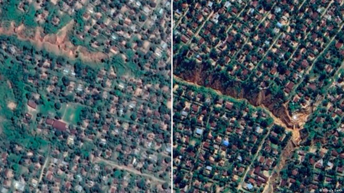 Urban gullies threaten cities across Africa and in places such as Brazil. Since 2020, gullies have been expanding at an accelerated rate, often with devastating consequences in densely populated areas. On Google Earth, you can see how gullies expand over time in cities across the DRC.