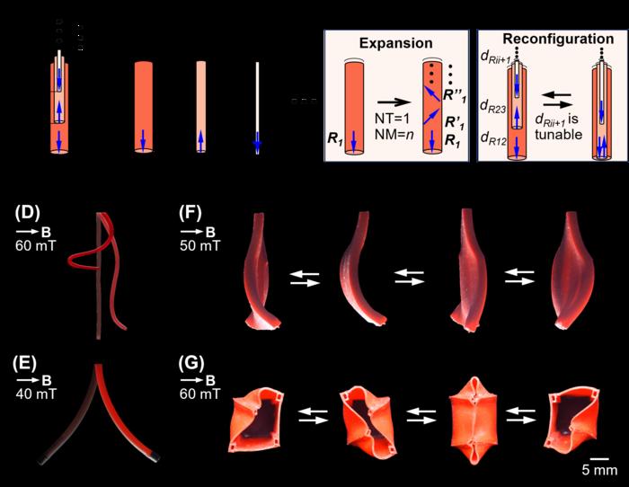 This real-time, in-situ generation and transformation of shapes has not been possible with previous magnetic robots. Now however, with the magnetic field kept constant, a tube can change from a straight line to a helix (Figure 1D), or deform in the opposite direction (Figure 1E). Moreover, this approach can be extended to two- and three-dimensional frameworks, enabling real-time switching between multiple deformation modes without altering the magnetic field (Figures 1F and 1G).