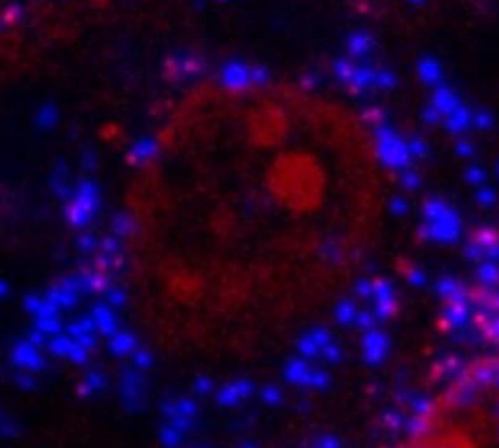 A micrograph taken at 400x magnification shows the interior of an MG-63 bone cell. Small polystyrene microplastic spheres appear inside the cytoplasm and are highlighted in blue. The cell nucleus is shown in red