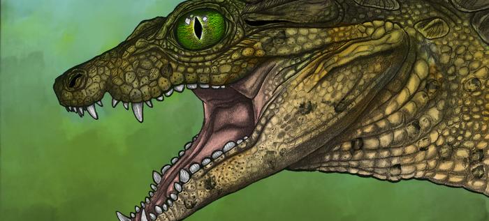 An artistic rendering of Thikarisuchus xenodentes, an extinct crocodyliform from the Cretaceous of Montana.