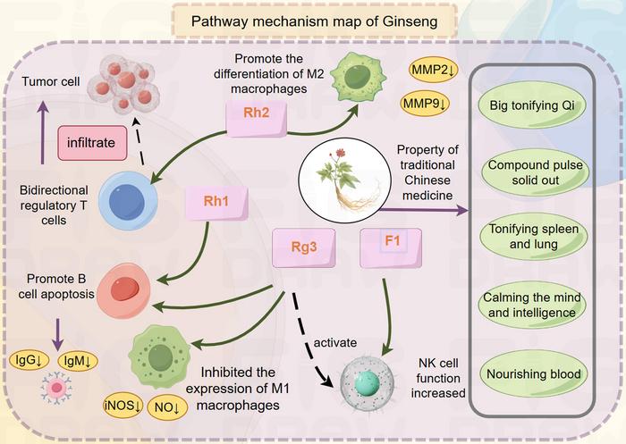 Created with Figdraw. The downward arrow indicates a decrease in content. The solid arrow represents “direct action”, with a clear path of influence; the dashed arrow indicates “indirect action”, which involves going through a roundabout route and achieving the effect through other factors. IgG, immunoglobulin G; iNOS, inducible nitric oxide synthase; MMP, matrix metalloproteinase; NK, natural killer; NO, nitric oxide; Rg, ginsenoside-Rg; Rh, ginsenoside Rh.