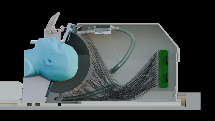 Cross section of the water-filled ultrasound helmet showing the ultrasound sources that transmit focused waves into the brain