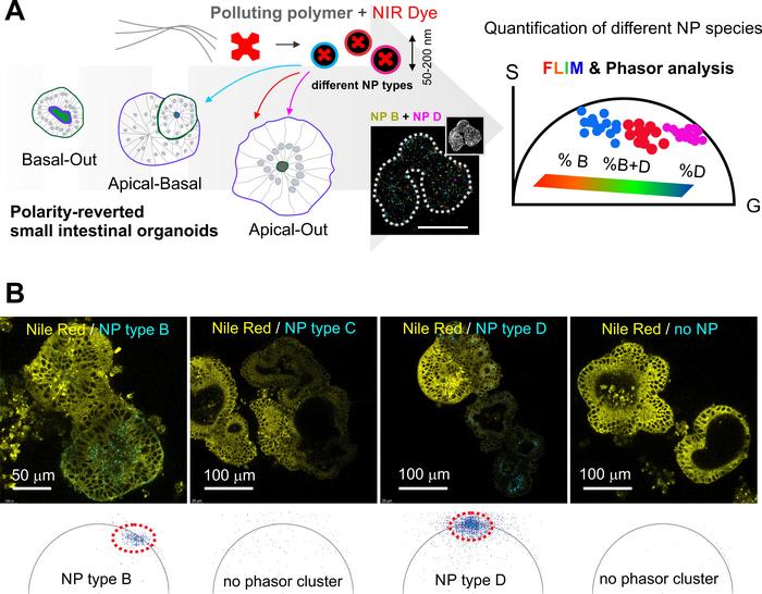 Figure | Principle of the phasor-FLIM barcoding approach and its application to studying the MNP interactions with small intestinal organoids. A, graphical representation of the approach. The polluting polymer is used for producing MNPs, labeled with the near-infrared dye, showing characteristic fluorescence lifetime. MNPs are exposed to the intestinal organoids (basal/apical-out…) with the polarity controlled by the live microscopy. Phasor-FLIM approach is used to analyze the uptake route, mechanism, physiological effect or quantifying the complex mixtures of the absorbed MNPs in the live organoid culture. B, confocal fluorescence images and corresponding phasor plots of organoids incubated with NPs (cyan), co-stained with Nile Red (yellow), demonstrate positive accumulation of only NP B and D, with the characteristic lifetimes confirmed by phasor-FLIM.