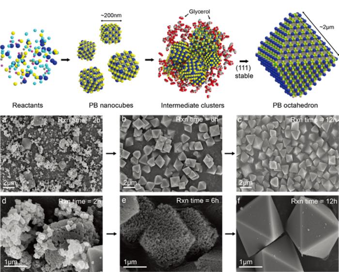 Schematic illustration of the particle formation mechanism of glycerol-based octahedral Prussian Blue
