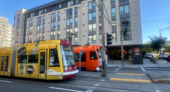 Two Portland Streetcars pull up in front of a multifamily dwelling, part of a transit-oriented development in Portland, Oregon. Photo by Nathan McNeil.