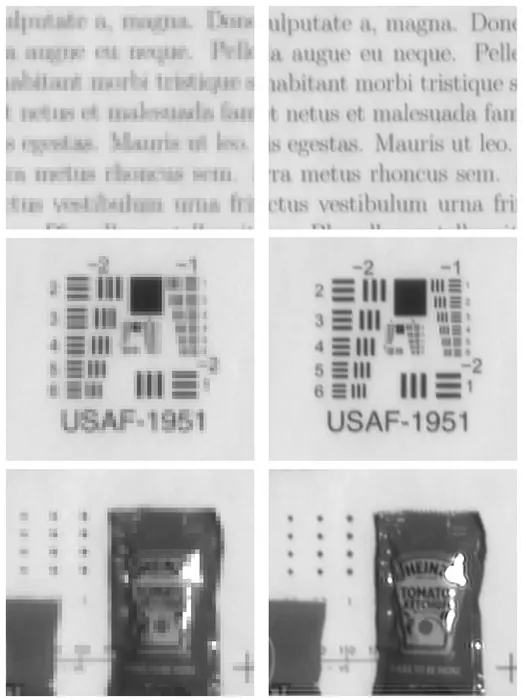 Images on the left were taken by a camera that was moving during exposure. Images on the right used the algorithm to increase their resolution with imformation captured by the camera's motion.