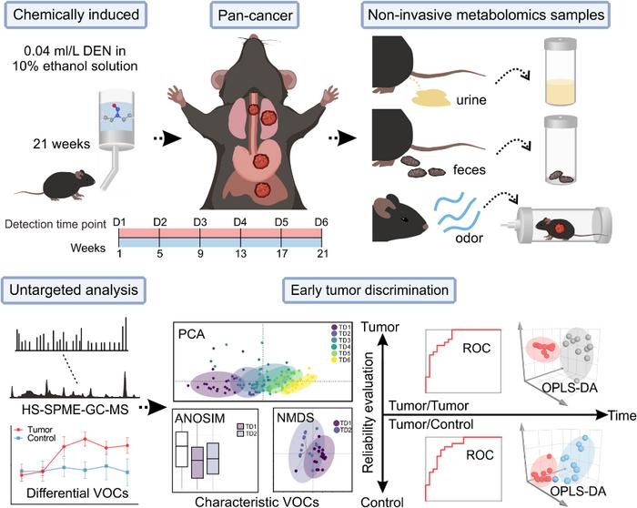 In this study, the team established a pan-cancer mouse model by chemically inducing tumors in organs such as the lungs, stomach, liver, and esophagus. Over a 21-week tumor development period, the researchers collected urine, feces, and odor samples from both tumor-bearing and healthy mice at six time points. Using headspace solid-phase microextraction gas chromatography-mass spectrometry (HS-SPME-GC-MS), they conducted non-targeted detection and analysis of VOCs.