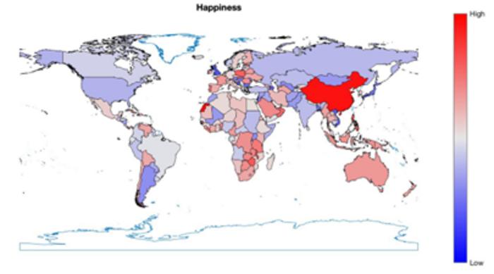 Figure. Level of happiness in national anthems by country. The happiest national anthems are marked in red, the least happy in blue.